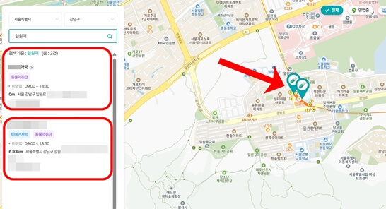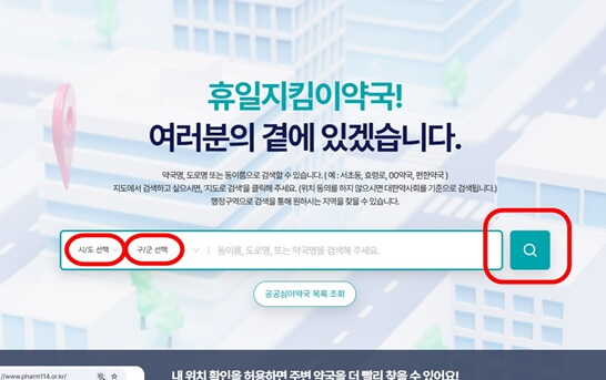 - 사용 방법: 접속을 하셨다면 먼저 본인의 위치에서 가까운 곳, 보통 현 거주지를 넣어 검색을 합니다 그럼 반경 1km 내외부터 그 이상 근처 일요일 주말 당직 약국인 영업 하는 곳을 알려줍니다.
